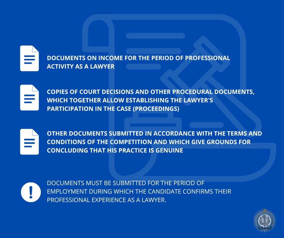 Please be informed that, to confirm one year of relevant work experience, no more than 5 documents (files) should be attached to the procedure card. The maximum number of files that can be added is 50 (up to 15 files is recommended), and the size of a single file must not exceed 20 MB. Please note that PDF files may be compressed, but such documents must be readable and must display the information completely and clearly. Detailed explanations on the submission of documents, in particular by lawyers, can be found at this link (in Ukrainian).