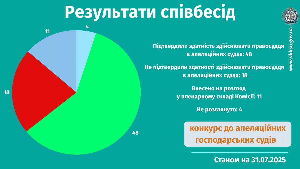 Загалом проведено співбесіди з 77 кандидатами: 48 кандидатів підтвердили здатність здійснювати правосуддя в апеляційному господарському суді, 18 кандидатів – не підтвердили, з 11 кандидатами співбесіди відбудуться у пленарному складі Комісії.