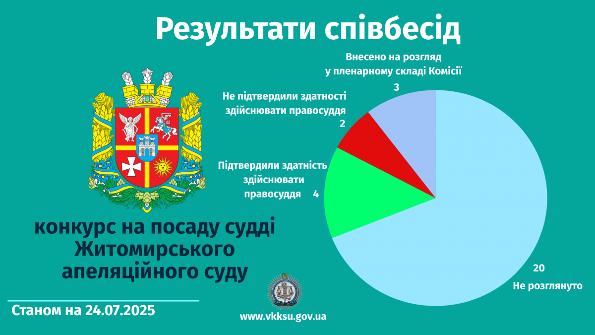 24 липня 2025 року в засіданні Вищої кваліфікаційної комісії суддів України у складі колегії проводились співбесіди та визначались результати кваліфікаційного оцінювання трьох кандидатів на посади суддів в Житомирському апеляційному суді.